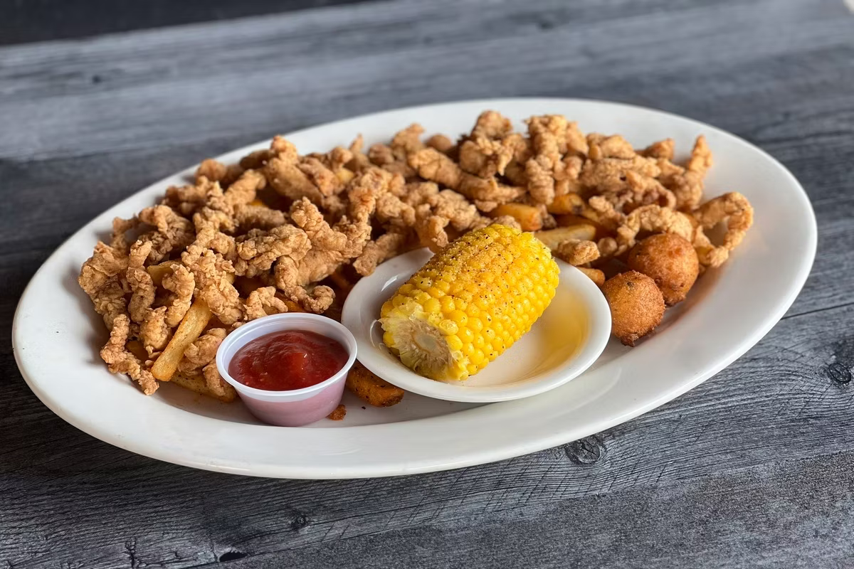 A heaping portion of fried gator. Served with dipping sauces, fries, hush puppies, and choice of one side.