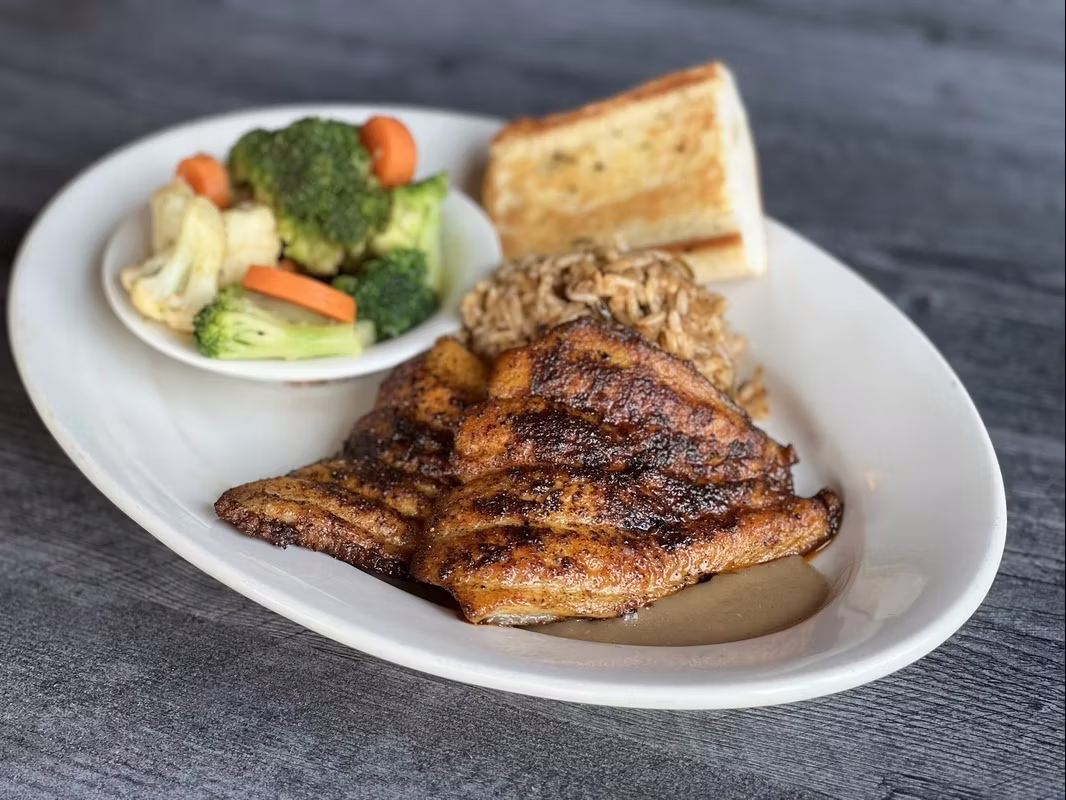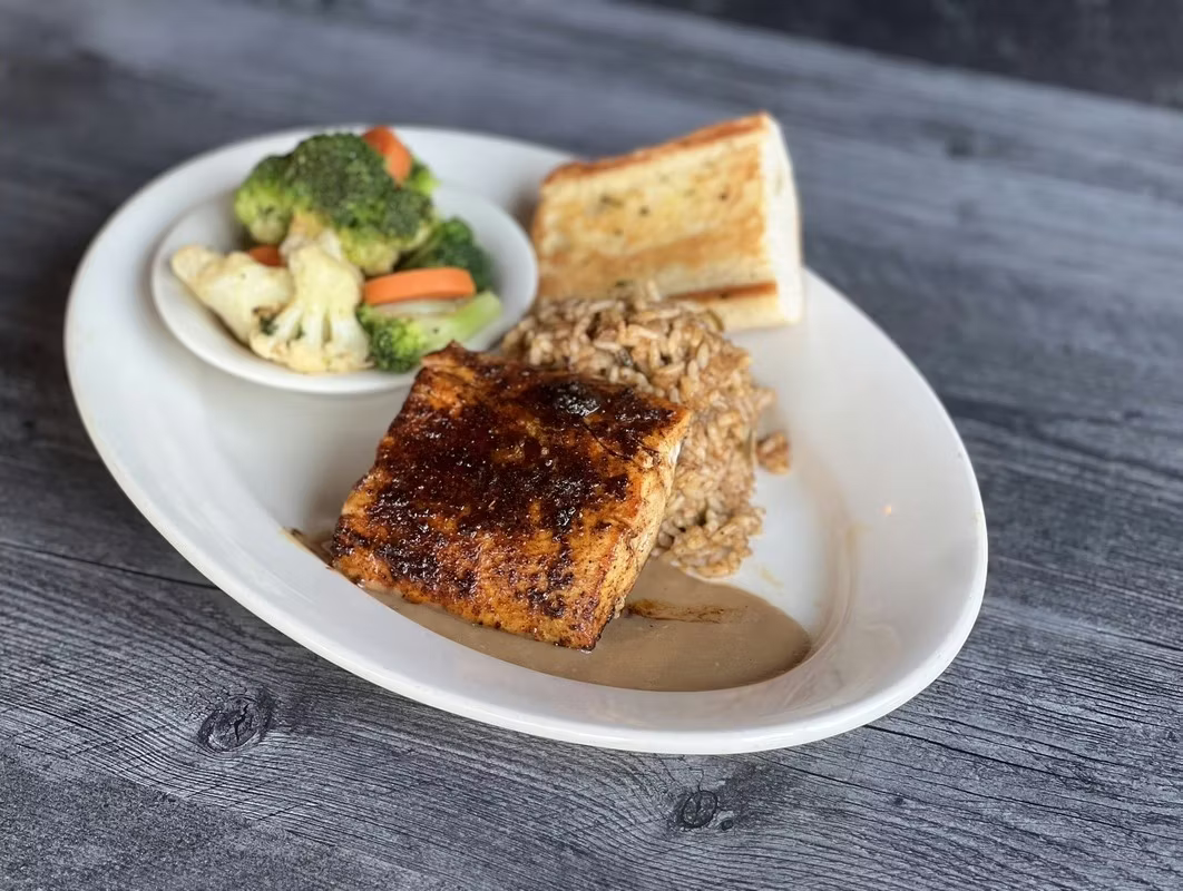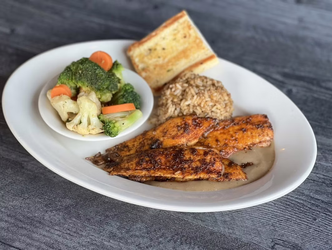 Blackened redfish served over dirty rice, topped with lemon butter sauce and shrimp. Served with steamed veggies & garlic toast.