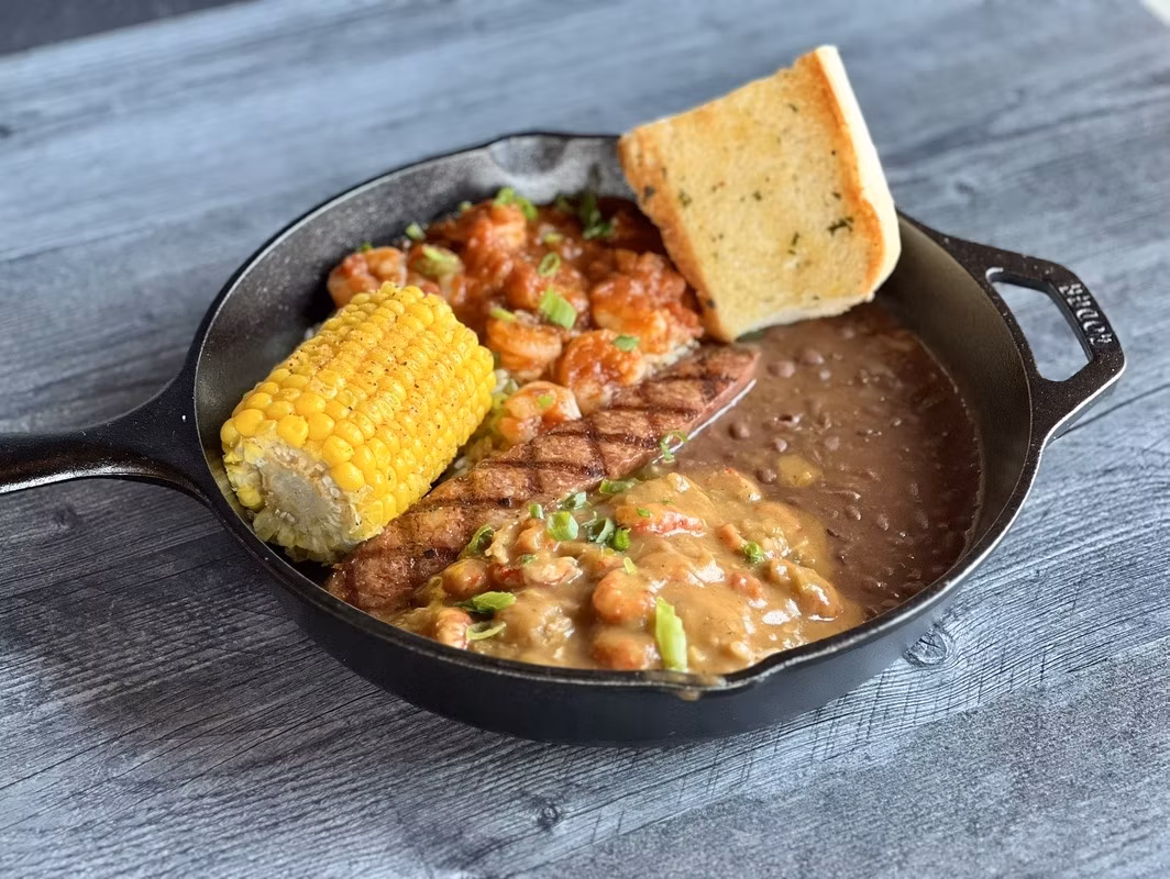 Taste it all! Grilled Andouille, spicy shrimp Creole, savory crawfish etouffee, classic red beans, & garlic toast.