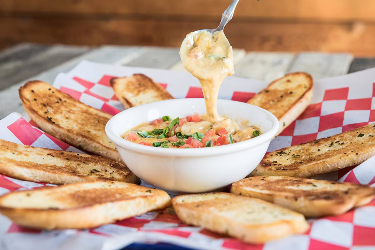 Crawfish in a creamy cheese sauce, served with garlic toast
