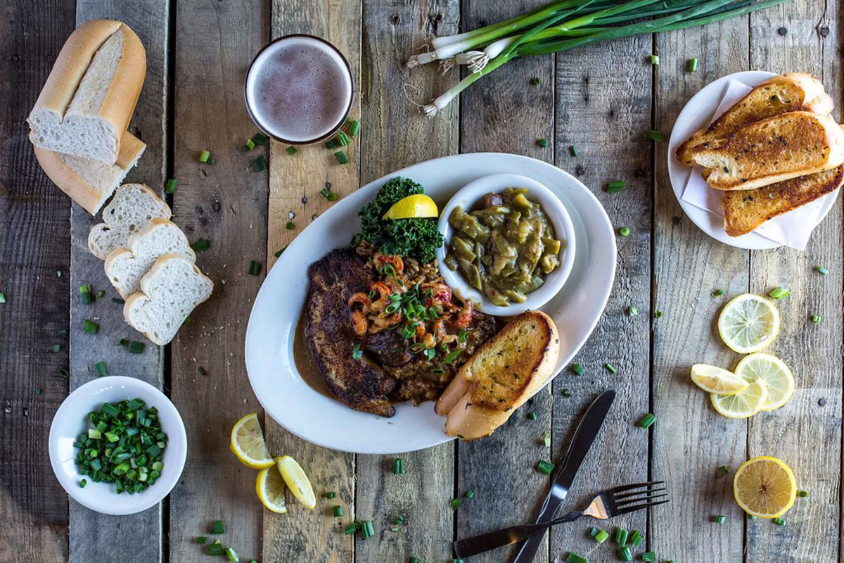 Our Famous Cajun Fried Steak topped with creamy andouille gravy. Mashed potatoes, green beans, & garlic toast.