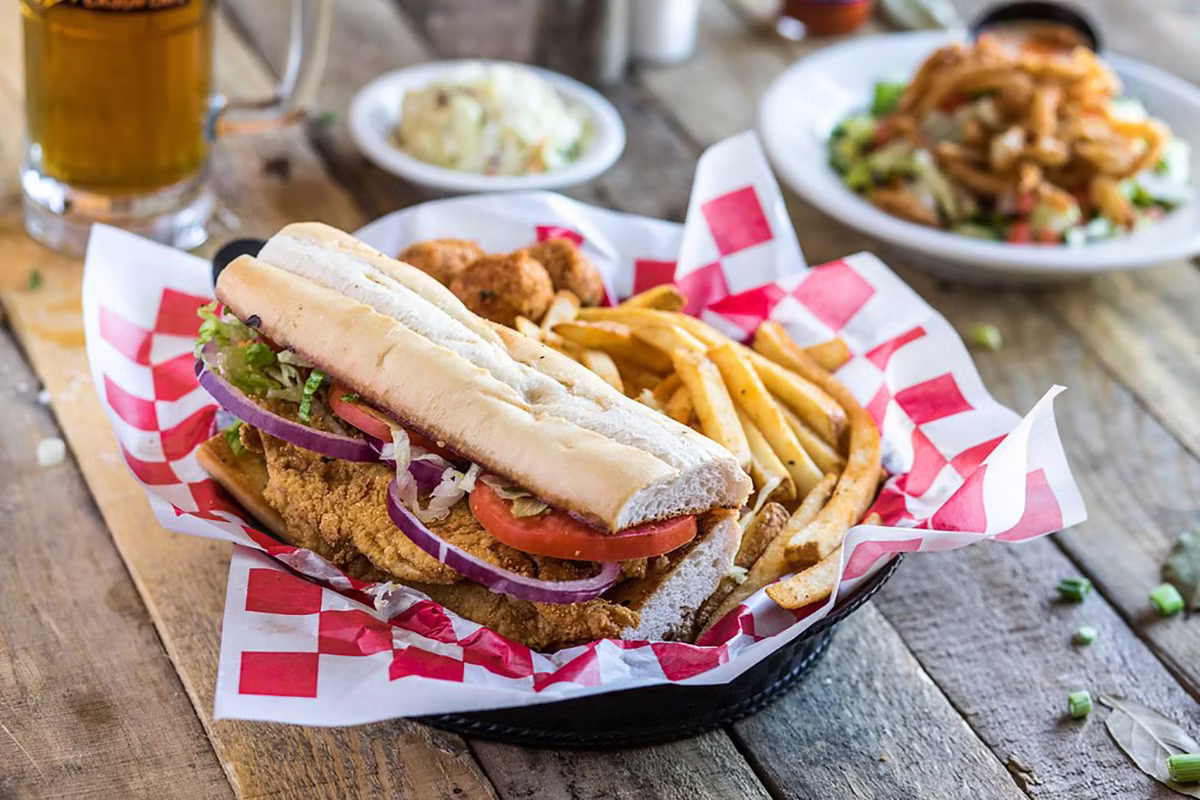 Toasted French roll with all the fixings. Served with hush puppies and fries.