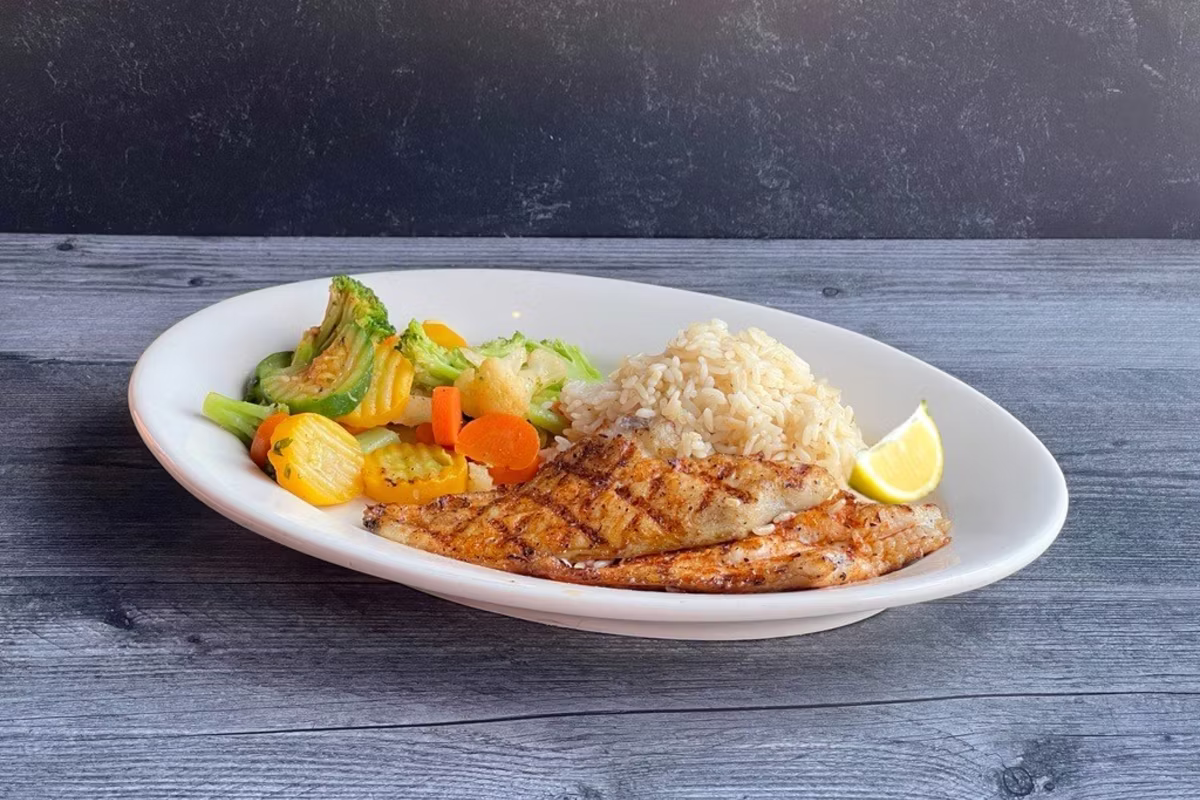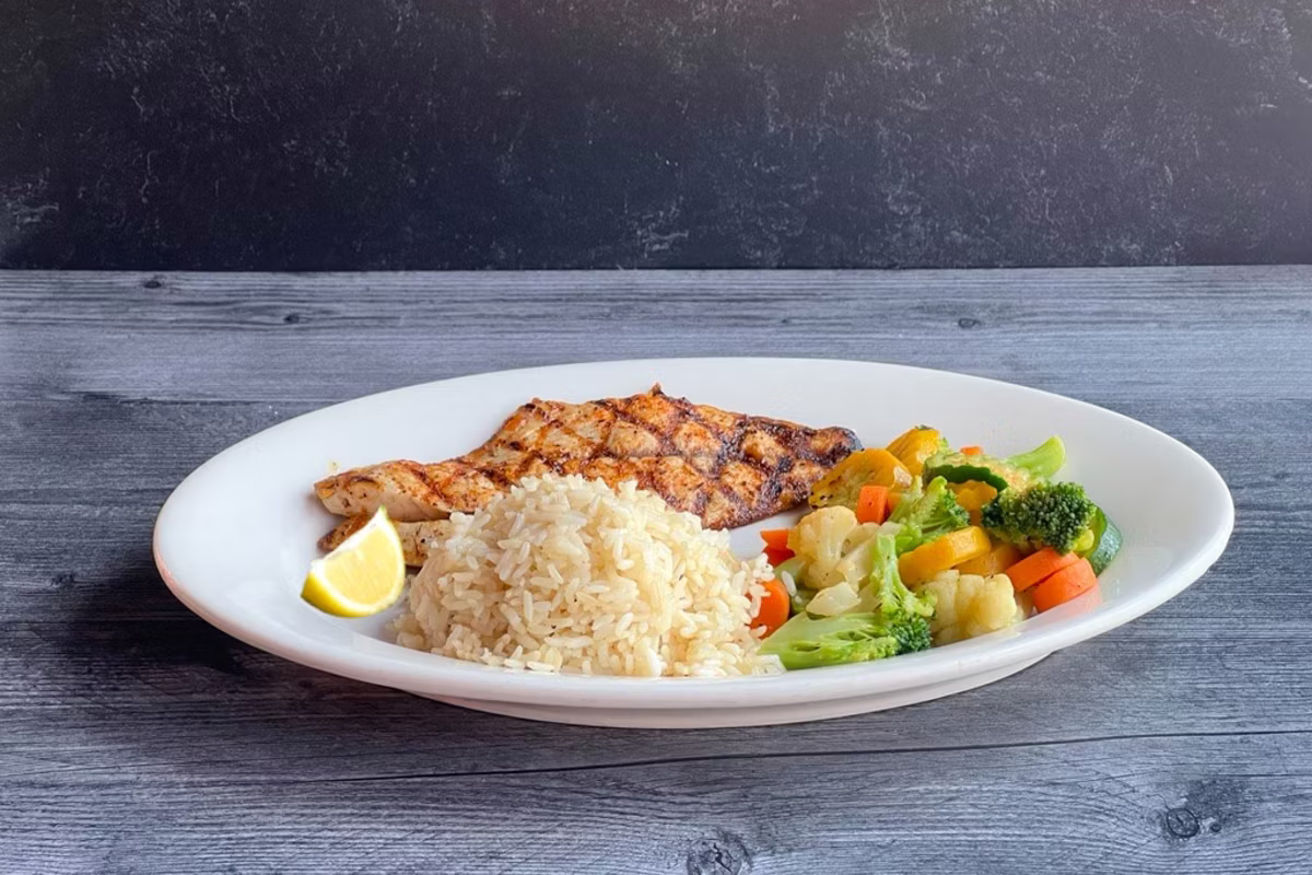 Grilled fish with white rice and steamed veggies tossed in garlic butter.