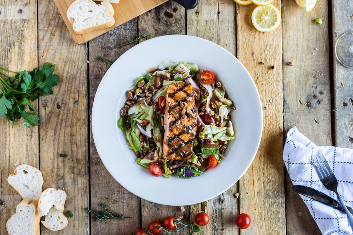 Grilled salmon fillet brushed with sweet & spicy hurricane glaze. Served with white rice and steamed veggies tossed in garlic butter.