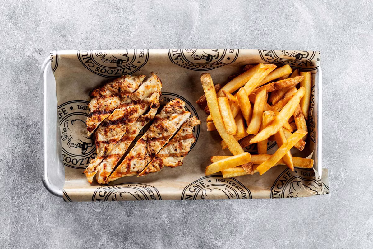 Lightly seasoned, grilled chicken strips. Choice of Side.