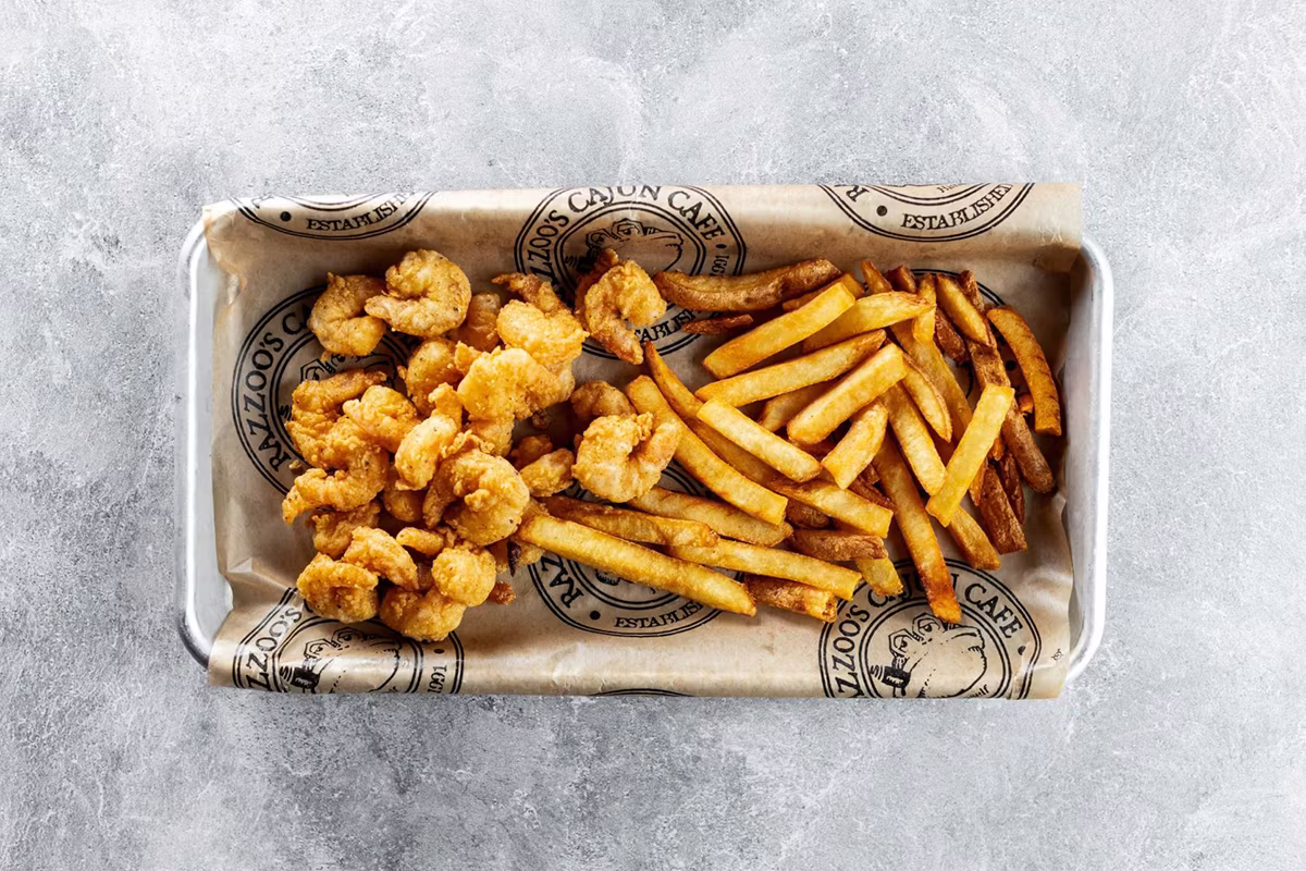 Popcorn shrimp hand battered, served over cajun season fries and dipping sauce