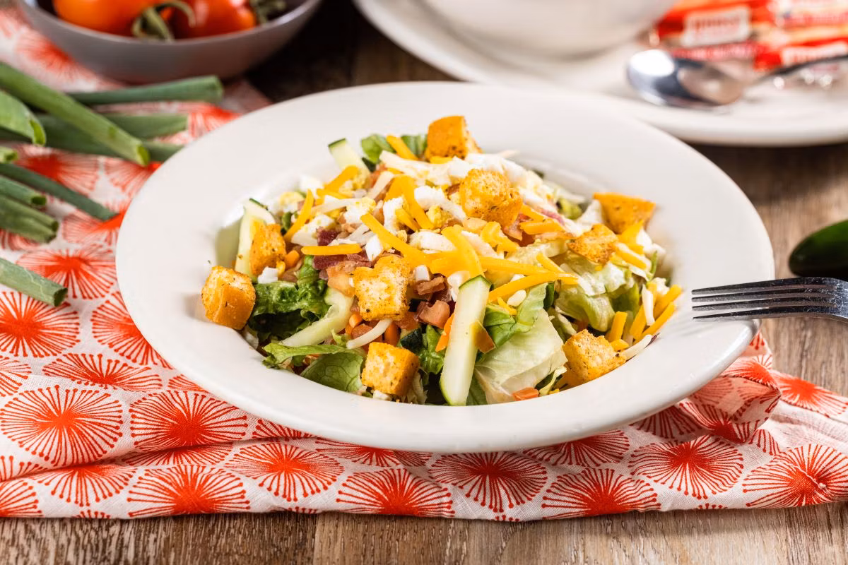 Romain and iceberg topped with crispy bacon, shredded cheese, diced egg, tomato and cucumbers