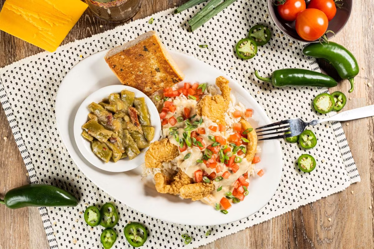 Perfectly fried fish strips over white rice with creamy jalapeño cheese sauce. Green beans & garlic toast.