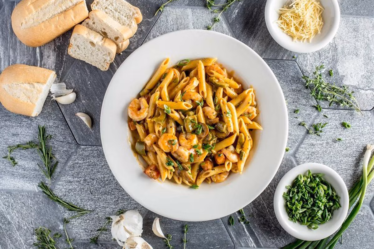 Penne pasta, andouille sausage, chicken, shrimp, and fish tossed in a spicy tomato cream sauce and topped with parmesan cheese. Served with garlic toast.