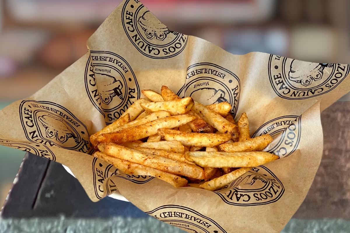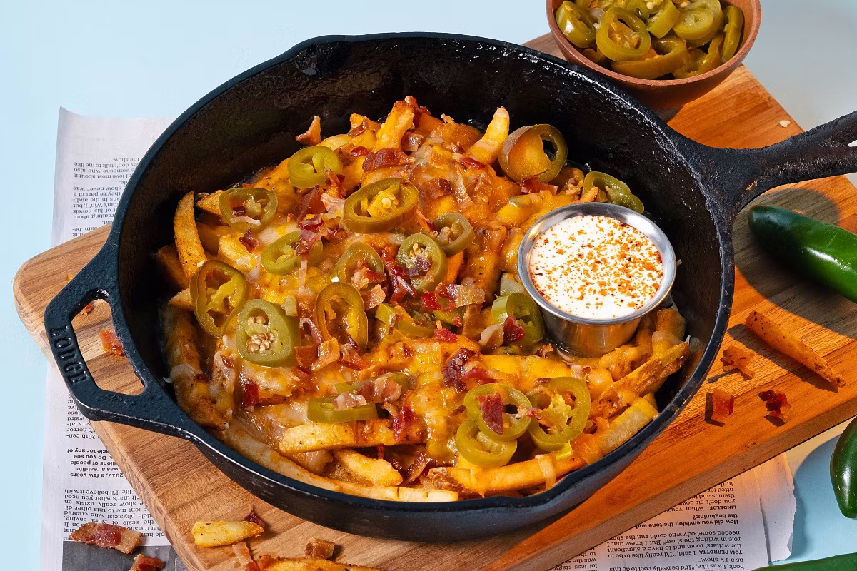 Bold mix of crispy French fries drizzled with spicy Bayou Ouch sauce, topped with veggies, Cajun buttermilk, a hearty blend of mixed cheeses, fiery jalapenos, and chopped bacon for a sizzling, savory treat