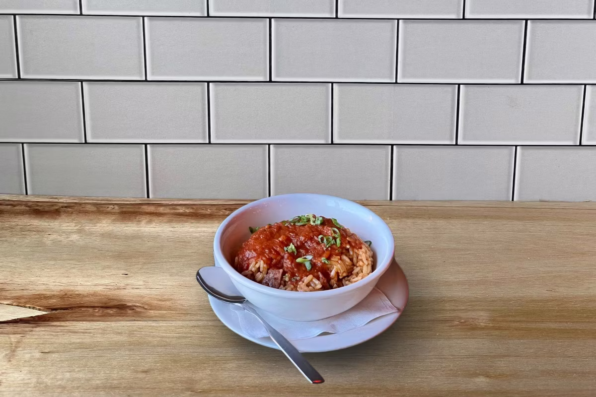 Hearty rice seasoned with ground beef, chicken, poultry seasoning, hot sauce, and veggies.