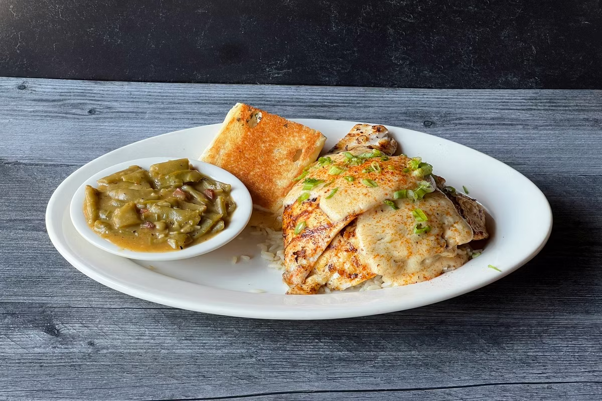 Grilled chicken stuffed with boudin and topped with jalapeño cheese sauce. Served with mashed potatoes, green beans, and garlic toast