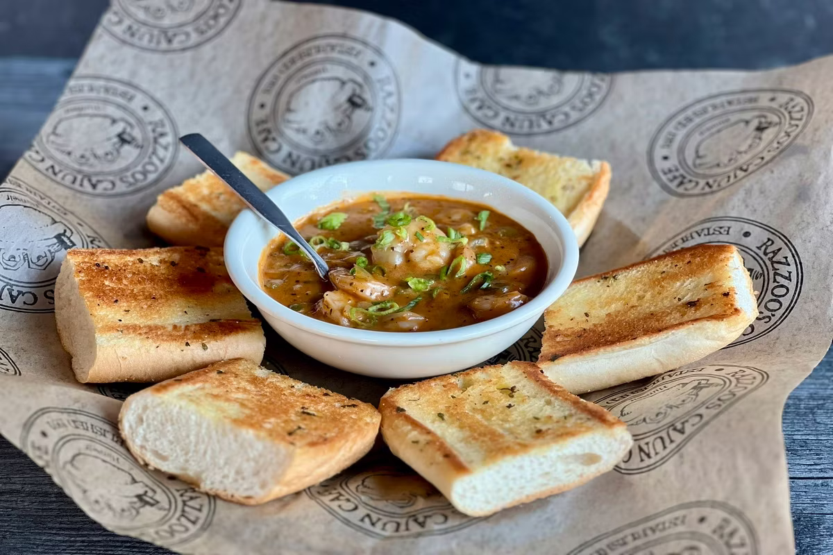 Choose shrimp, chicken or crawfish in a rich dark roux sauce. Dirty Rice & garlic toast.